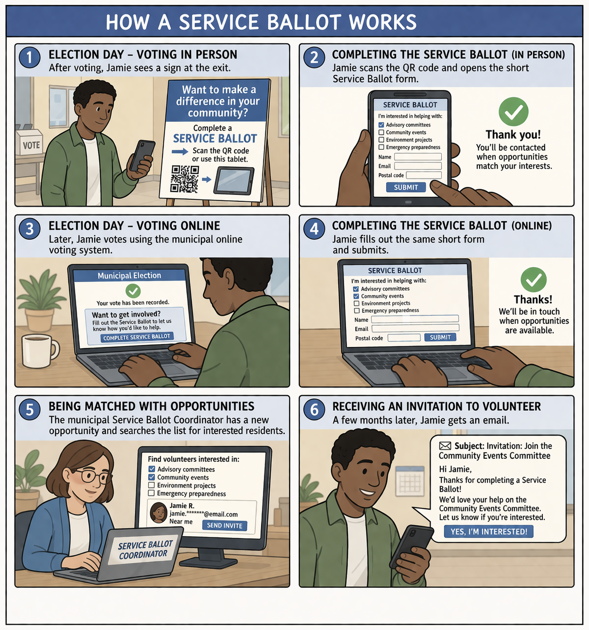 A Service Ballot is a way for governments to build a roster of volunteers to advise public decision-makers and participate in other community activities. After casting their electoral ballot for their preferred candidate, voters are invited to fill out a short form—called a Service Ballot—indicating the kinds of volunteer opportunities that interest them. These could include attending a public meeting, joining an advisory committee, or helping with other local initiatives.